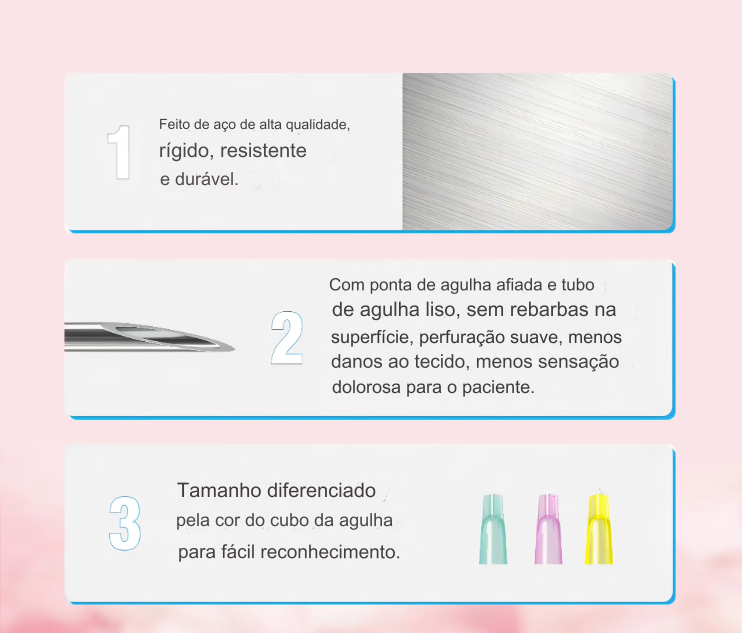 Agulhas para mesoterapia hipodérmicas, descartáveis e com conector luer. Fabricadas em aço inoxidável com conexão à seringa em resina de polipropileno.