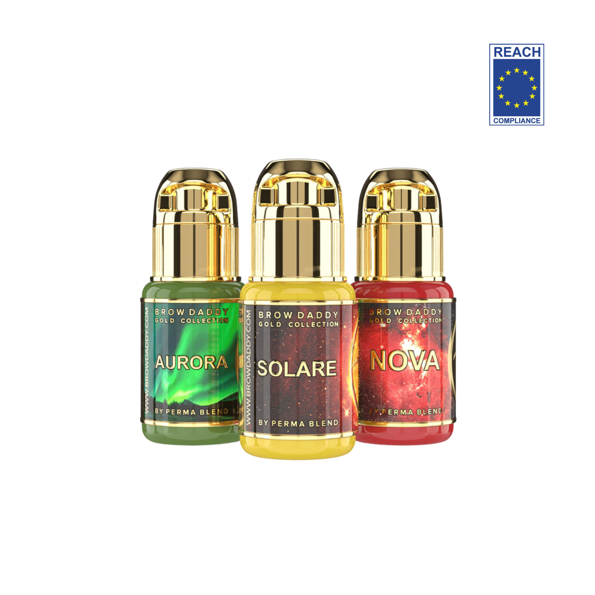 Aurora é um pigmento verde poderoso e frio, perfeito para refrescar cores quentes ou corrigir sobrancelhas vermelhas. Solare é um amarelo quente extra opaco, perfeito para corrigir sobrancelhas roxas ou como modificador em clientes pálidas. Nova é um laranja muito profundo com alta carga de pigmento, perfeito como modificador ou corretor quente.