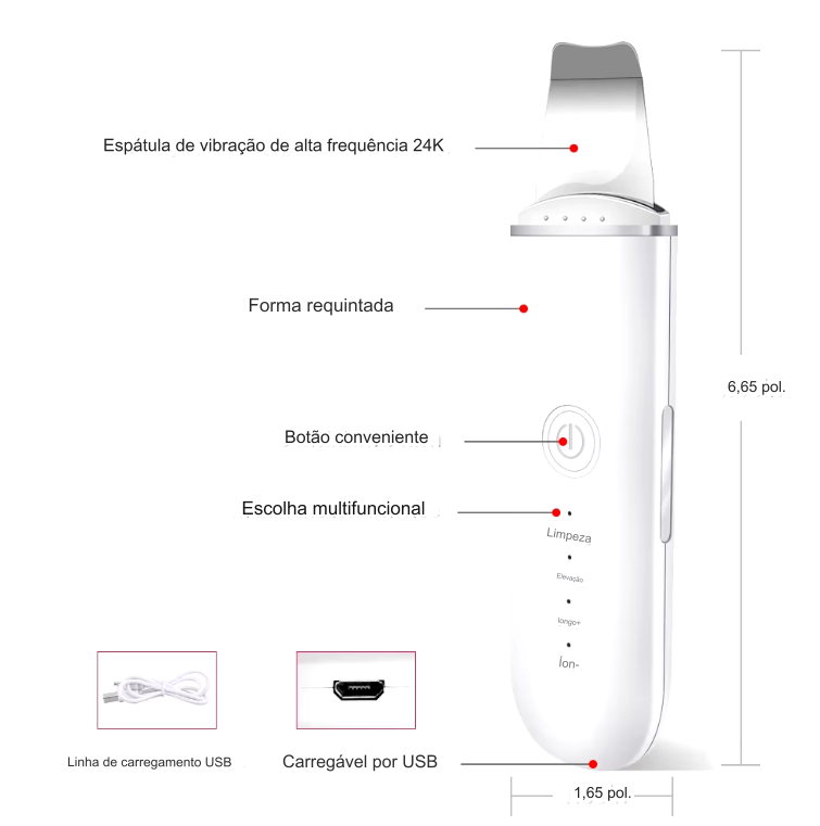 Nota: Hidrate a pele antes de usar ou use-a com produtos de cuidados da pele. O esfoliante ultrassónico tem função de tempo e desliga automaticamente após 10 minutos.