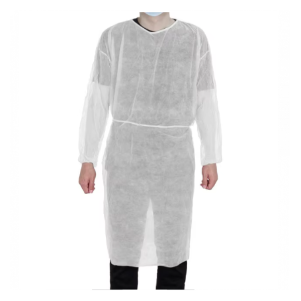 Batas descartáveis c/ elástico nos punhos, pescoço e cintura de tamanho único, com composição em polipropileno de 25 gramas.
