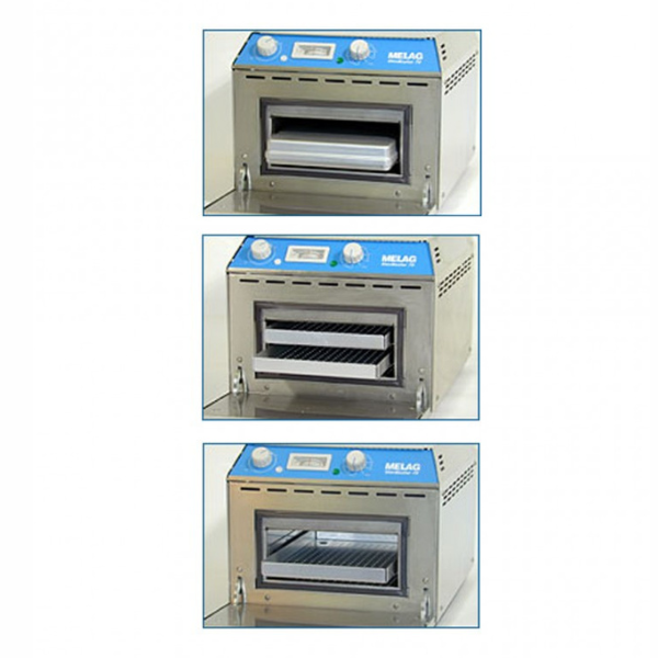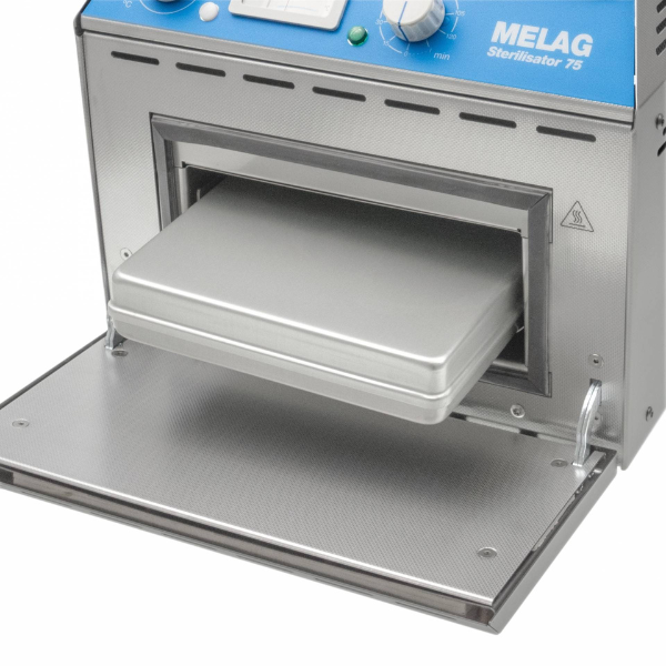 O esterilizador de ar quente Melag Sterilizer 75 é fabricado em aço inoxidável de alta qualidade, o que confere ao produto uma vida longa de utilização em padrões internacionais. O volume total é de 4,3 L e há espaço para dois reservatórios ou uma cassete de alumínio.